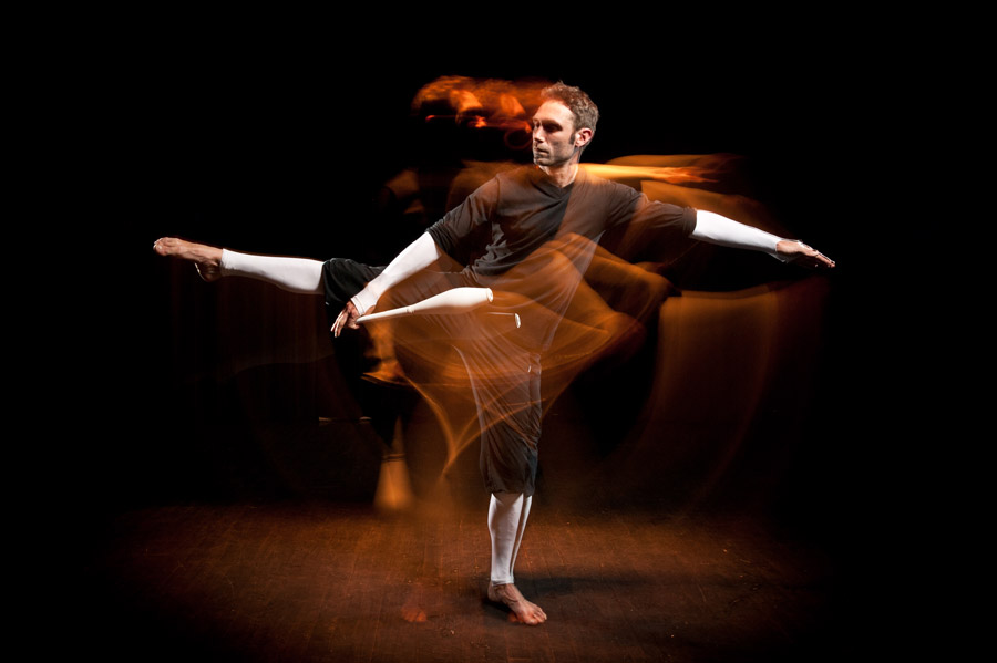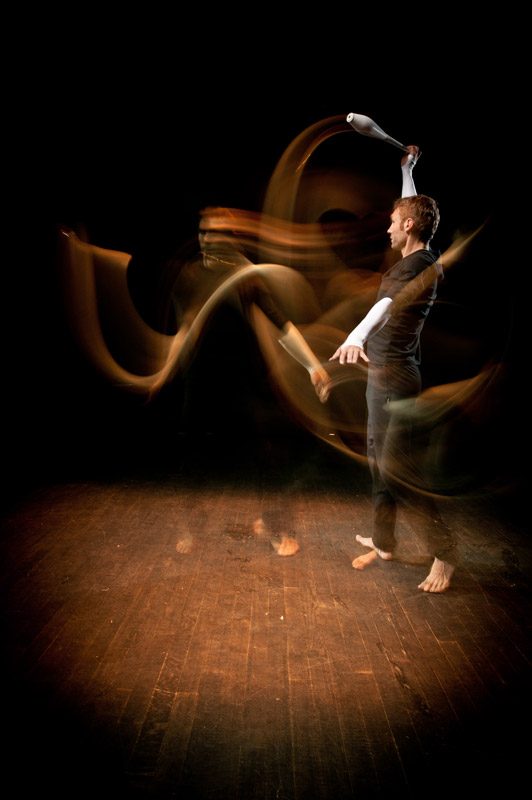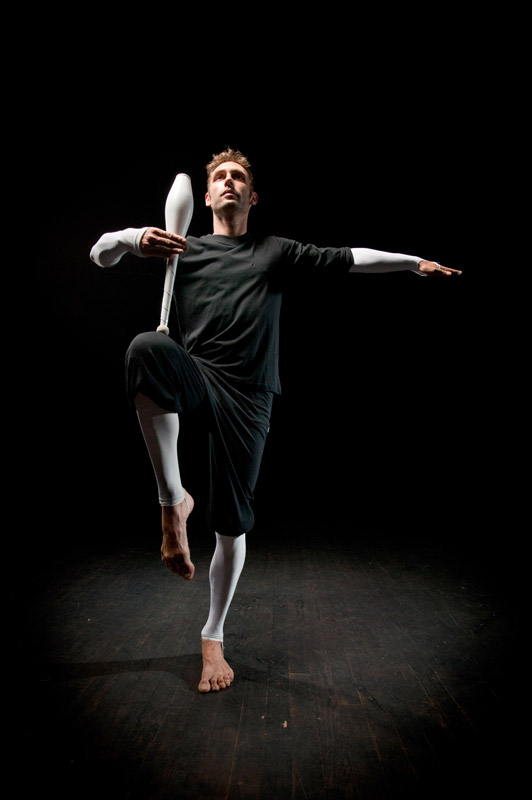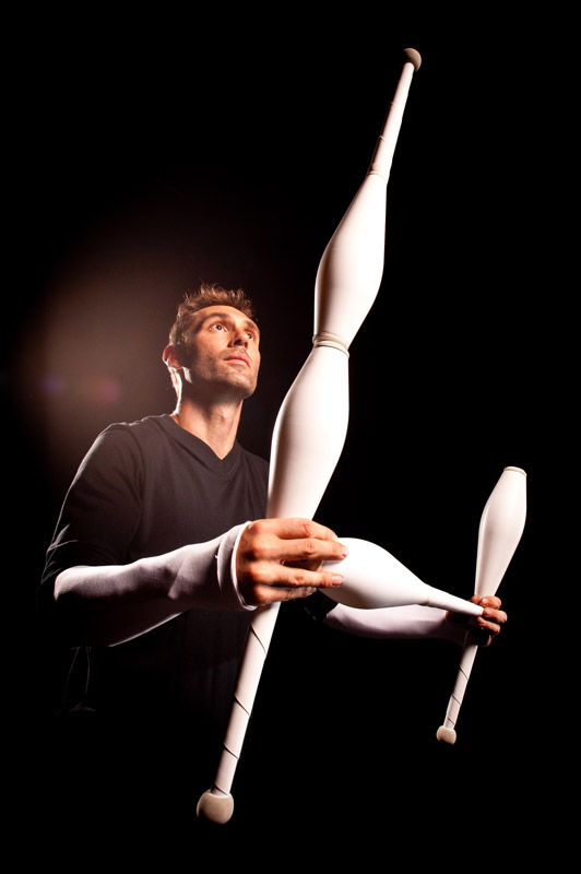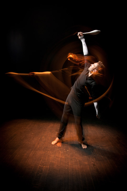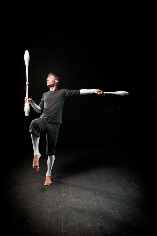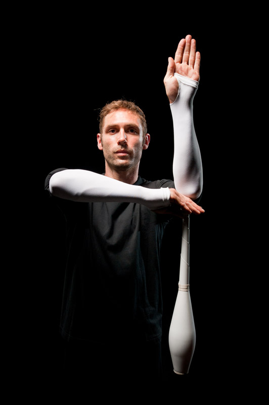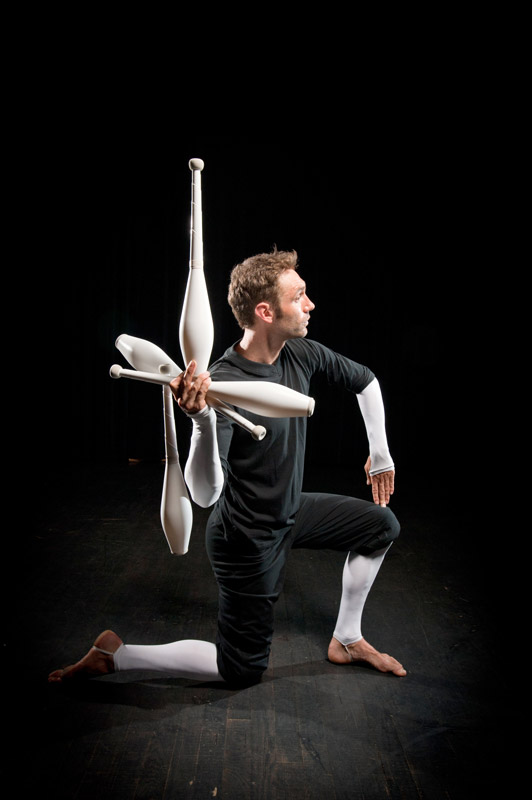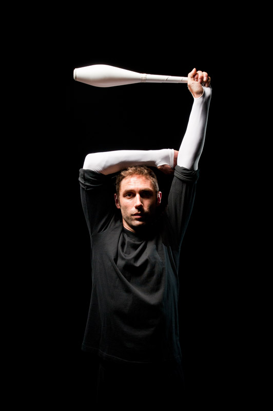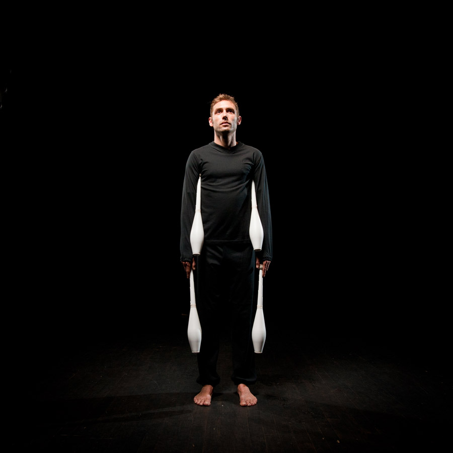 Ce solo de jonglerie de massues est une approche originale autour du corps, de la forme et de la couleur. Massues, parties de corps et couleurs se confondent, des jeux de lignes, de courbes et d’angles se mettent en marche pour offrir des effets visuels hypnotiques. La musique composée sur mesure suit chaque trajectoire de mouvement, et emmène le spectateur à suivre une danse enivrante. « Blanc » est une approche actuelle et graphique de la jonglerie.