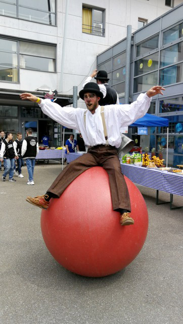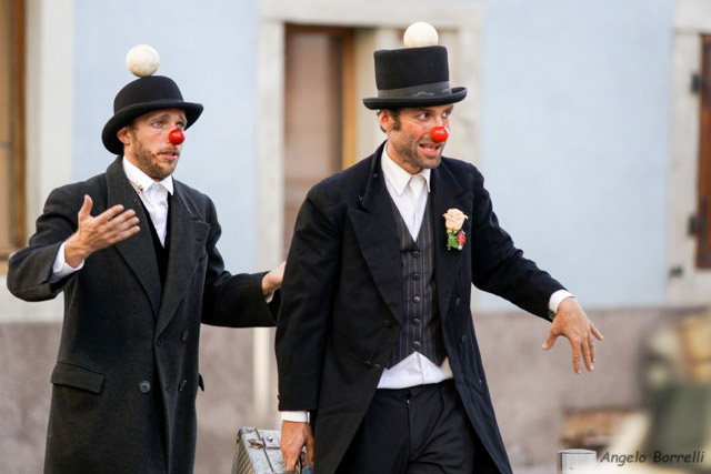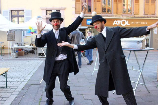 Les costumes type 1900 sont chics et présentables, intégrant facilement les clowns dans n’importe quel décor. Ainsi l’image traditionnelle du clown est volontairement transformée. Suivant le thème, différents objets peuvent accompagner les deux clowns pour alimenter leurs improvisations.